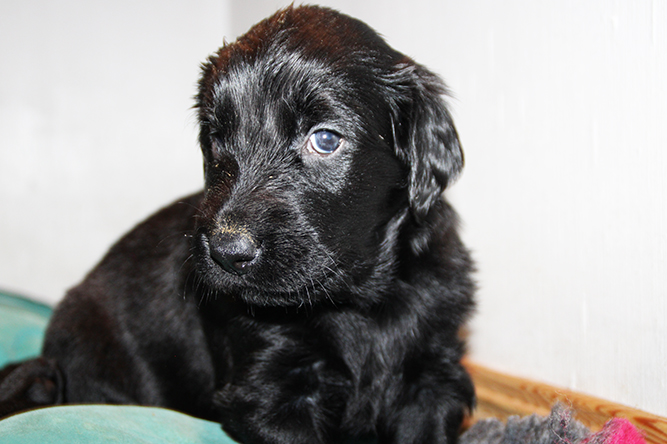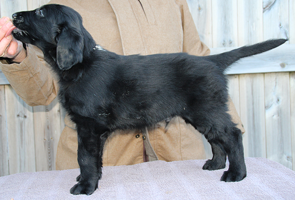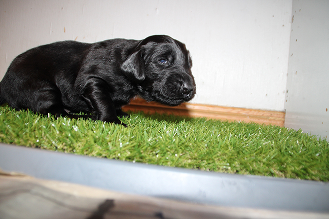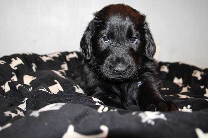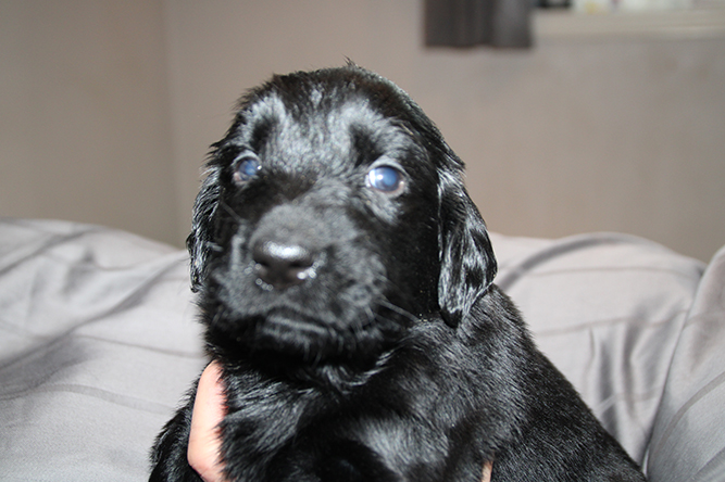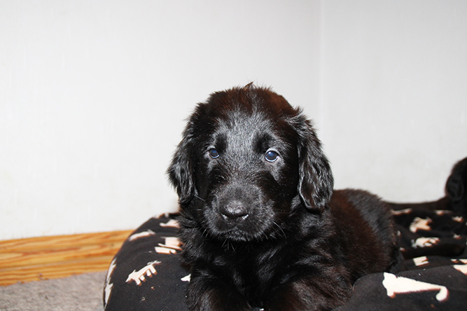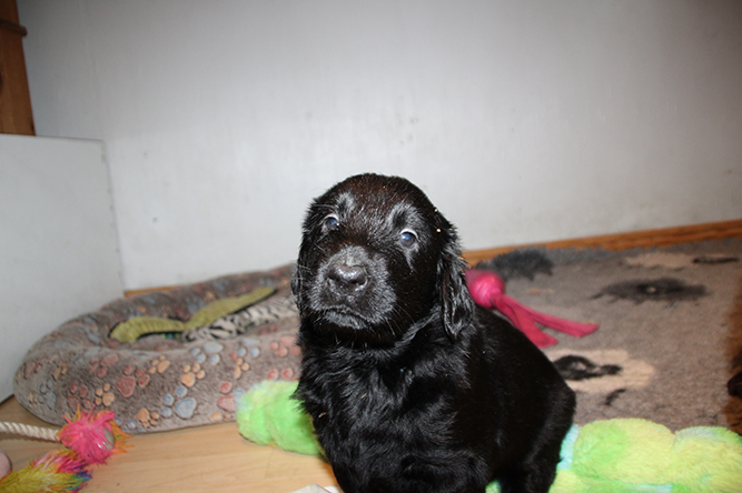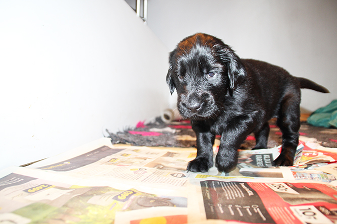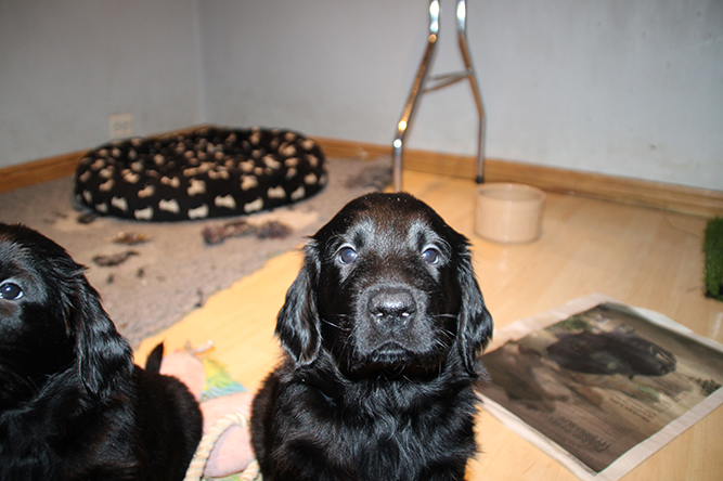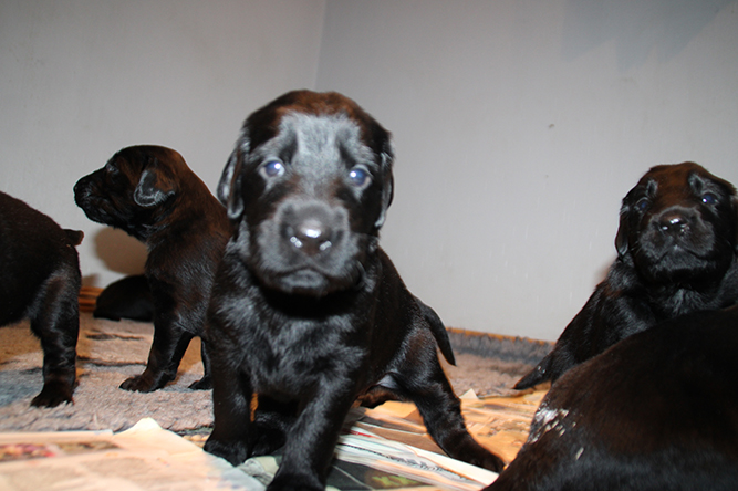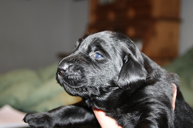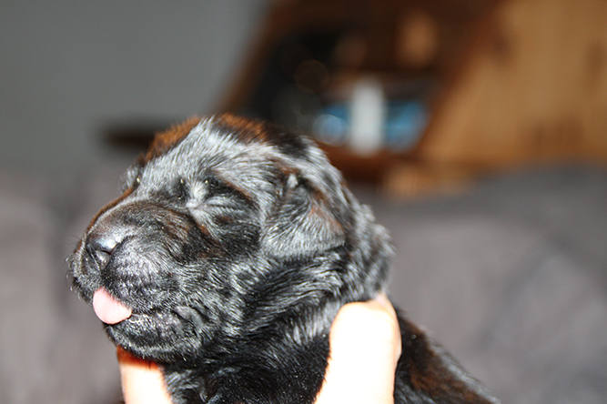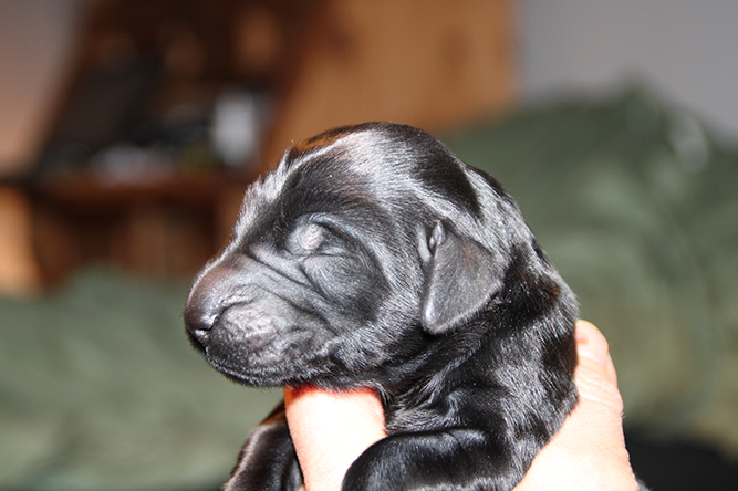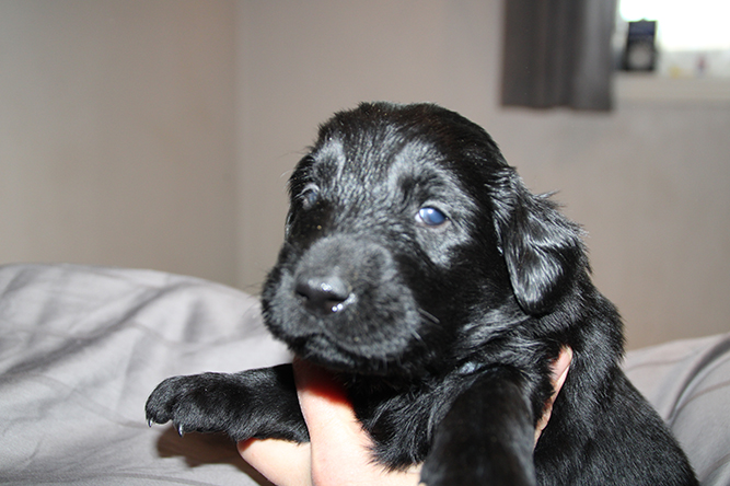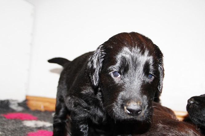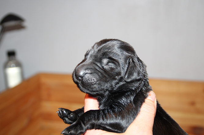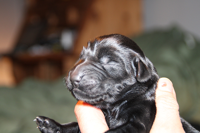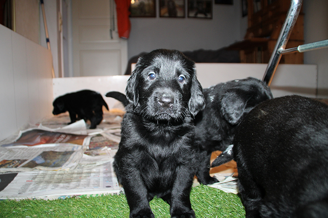 30.01.25. I går mistet vi Lava. Hun var dessverre ikke utviklet nok så det gikk ikke mer :-( Kjempe trist. De sorte gullene er blitt så flinke nå til å løpe ut for å gjøre i fra seg når døren går opp. Vi har minket bra på aviser på dag tid så nå er det bare noen rett ved døren. De kommer nå når vi blåser i fløyten. Og er blitt så flinke. De kosa seg med besøk i stua i går. Og når vi skulle inn på valperommet igjen var det noen som klarte å gå hele veien selv :-) I går kveld prøvde vi å gi eukanuba uten å mose den til grøt. Å jammen gikk det ned så det suste. Så nå begynner det virkelig å bli små flinke hunder her :-) Jeg må jobbe ekstra i dag pga sykdom men Inger Johanne passer hus å hunder. Så alle er i trygge hender her :-) Her er jente rumpe /Lunaog gutt rumpe/Atlas