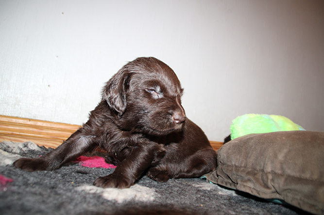 02.01.25. Nå er det to troll som glipper med øynene. De første dagene er det vanskelig å ta fine bilder av de små. De kniper fort igjen når det blitzer :-) Øynene er knall blå i starten før de etter hvert går over til en grå nyanse for til slutt å bli nøttebrune :-) Dessverre klarte de ikke å finne Mistie i går. De lette helt sykt masse og hva rover det meste i nærorådet.I dag er det nye folk som skal lete å vi håper virkelig hun blir funnet. Men etter som dagene går et kjangsen mindre og mindre for å finne henne i live i kulden. Jeg er så lei meg her hjemme. :-( Når vi får valper blir det knyttet bånd til hver og en ,å vi vil jo helst at de skal bli gamle fine hunder som får et langt og fint liv. Det er våres hjertebarn alle sammen ,så dette er så vondt .Som sagt er det ikke så lett å ta fine bilder av de små når det blitzer så kniper de øynene sammen :-) men her er jente høyrebak og Brun jente :-)