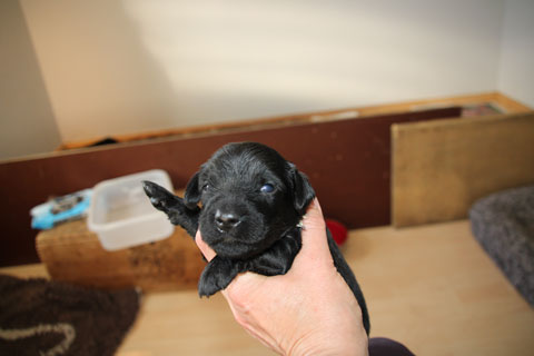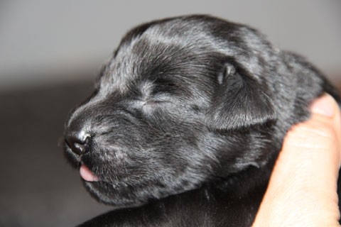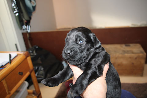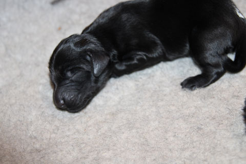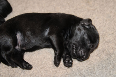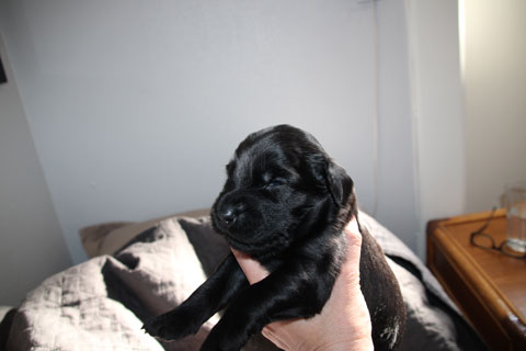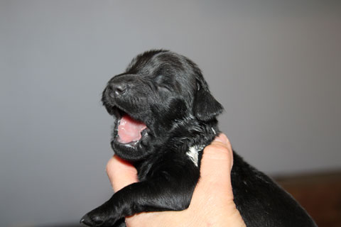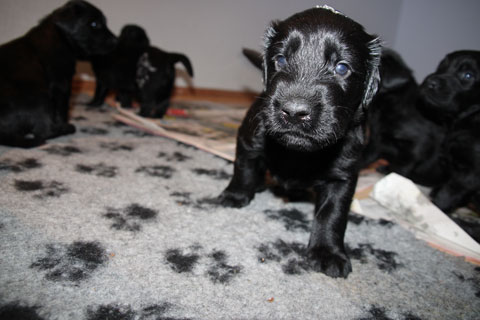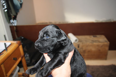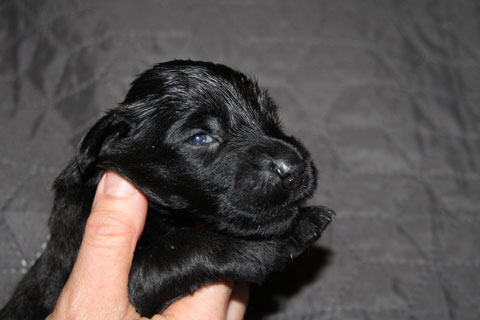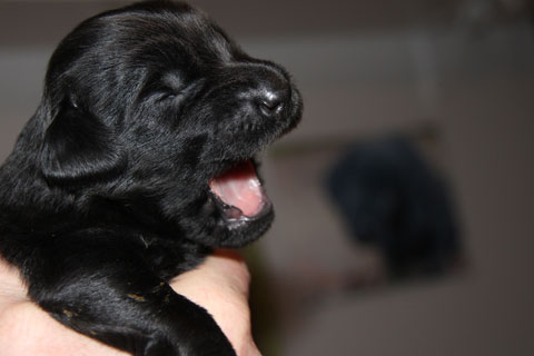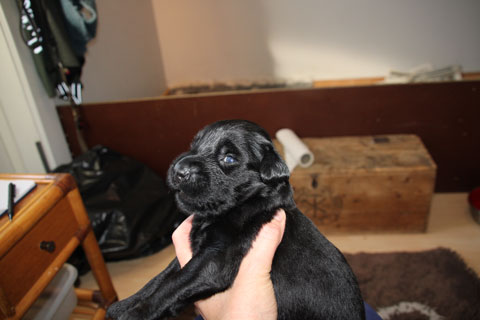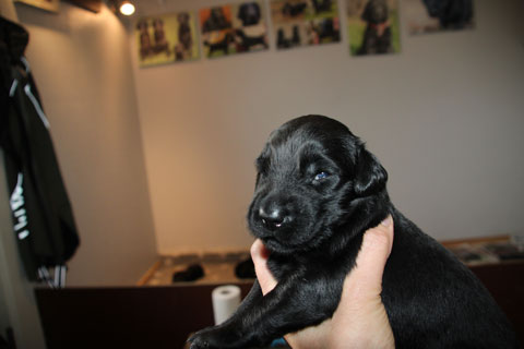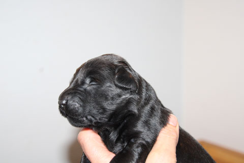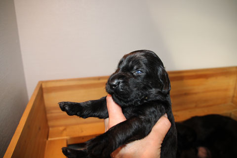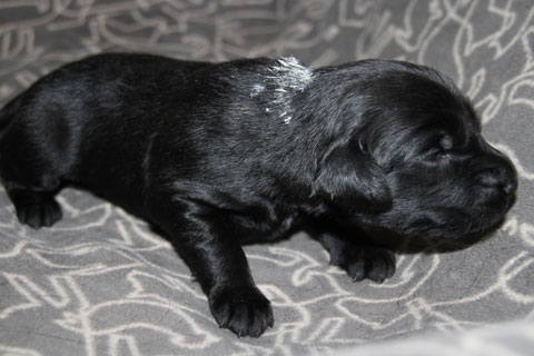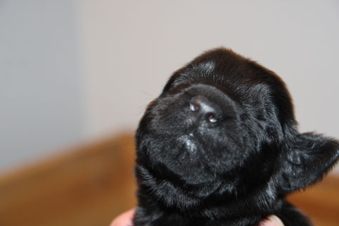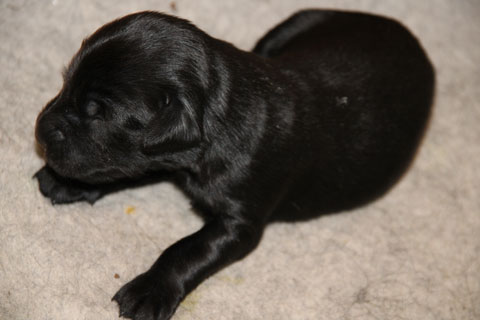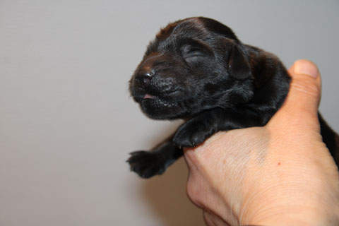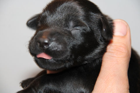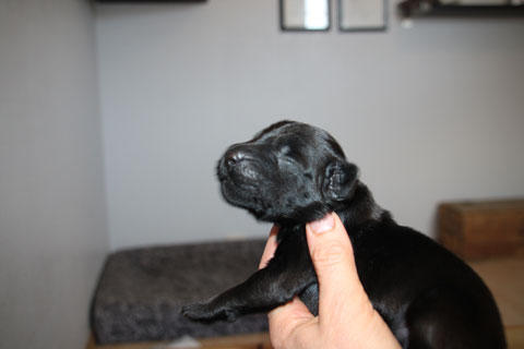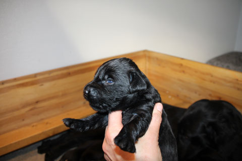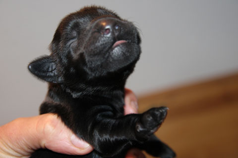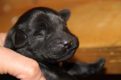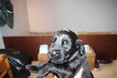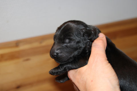 02.04.20. Nå har de første valpene begynt så vidt å åpne øynene :-) det er så spennende .Foreløpig er det små gløtt i øyen kroken på flere men i løpet av dagen og morgen dagen tenker jeg de har åpnet mer. De kniper når det blitzer når jeg tar bilde foreløpig så ikke lett å få det på bildet :-) Her er Gutt merket venstre bak og gutt merket høyre bak