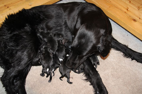 24.03.20 .Nå er klokken blitt 10.45 og fra kl 07.30 til nå har Norah født 3 tisper og 7 hanner. jammen har de kommet ut i rekord fart når hun først begynte å føde :-) Jeg er  usikker på om det er flere men vi får se ann litt til før vi skifter teppe og dusjer Norah. Hun elsker alle sin små og er så fornøyd :-)