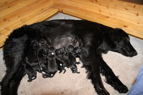 24.03.20. Nå tror vi alle er kommet ut. med morkaker og alt som skal er som det skal :-)Fra første mann kl 07.30 til siste snuppa kl 10.32. så har det gått kjempe fort med 10 valper. Norah er like rolig og flink :-) Vi følger med videre i tilfelle hun skal ha gjemt noen lenger bak men som sagt tror det er tomt. Nå  har Norah badet å fått nytt teppe å ligger å koser seg med sine 10 skjønne troll :-)
