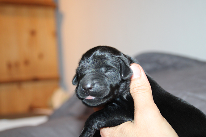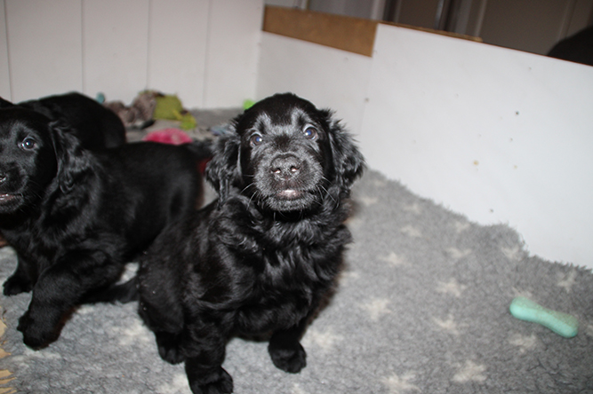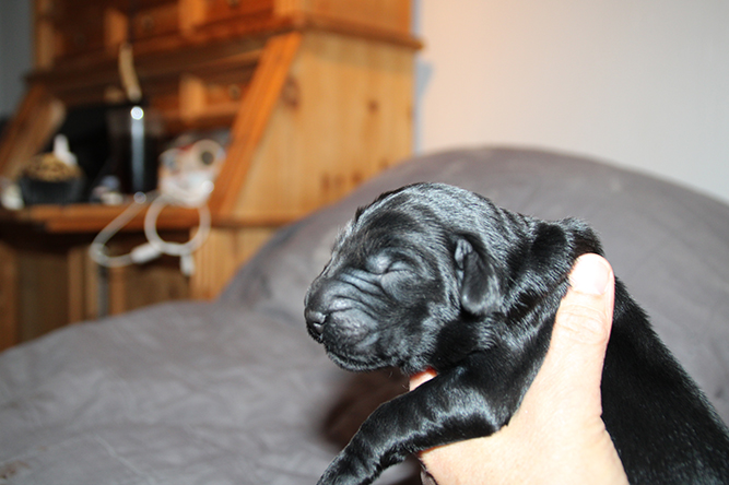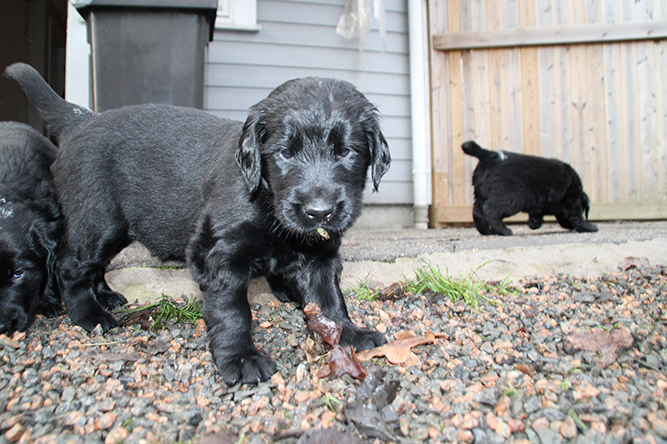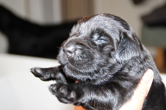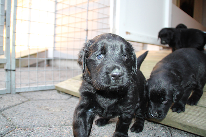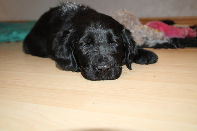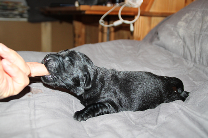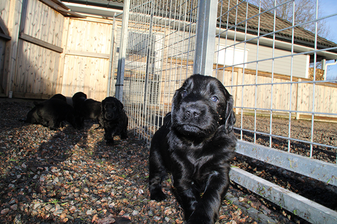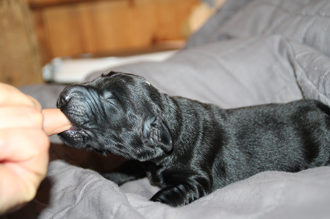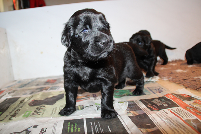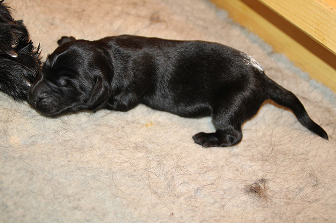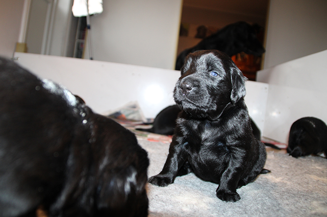 28.10.21. Det er fart i de små sorte gullende når de våkner nå. De åler seg fort gjennom valpekassen på leting etter puppen og melken :-) Ikke alltid like lett å få lagt seg Mille står noen ganger å ser litt fortvilet ned på haugen med skjønneste som åler rundt å funderer tydelig på hvor skal jeg legge meg fort ned så jeg ikke ligger på noen . :-) Hun er kjempe flink :-) Her er jente merket på rumpen og gutt merket på rumpen