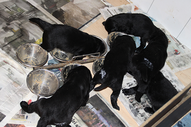 11.11.21. Trolla elsker grøten sin . Nå har vi begynt å blande inn litt mosa Eukanuba . Alt skjer gradevis og de elsker maten sin. I dag øker vi til 4 små måltider. Mille har gått ned til å gi melk 4 ganger i døgnet. så tilsammen er det 8 måltider de spiser nå :-) Her er jente venstre bak og jente høyre bak.