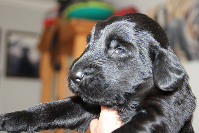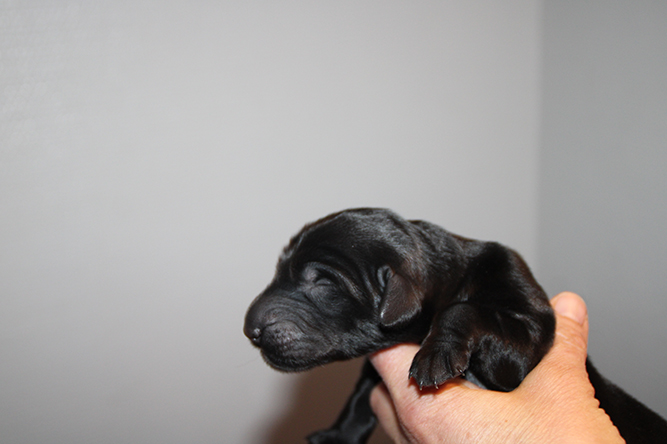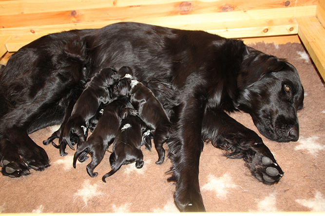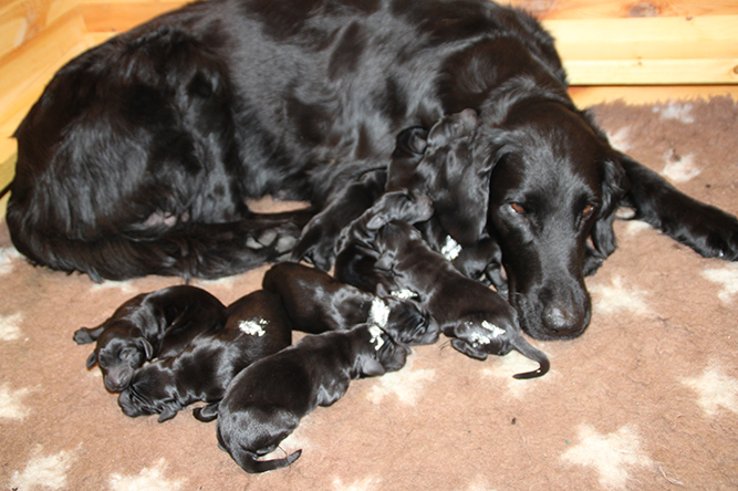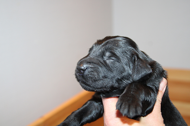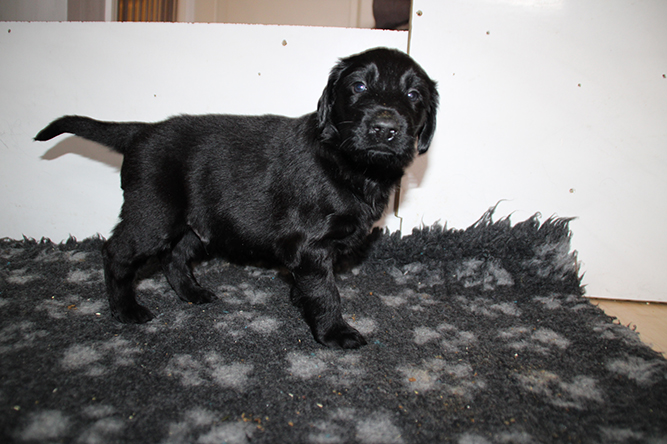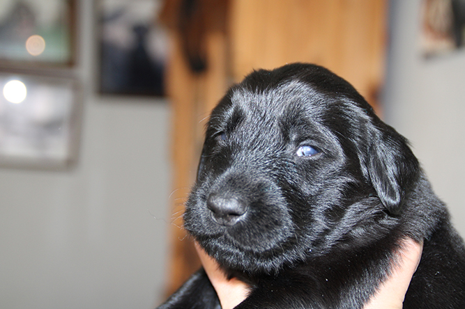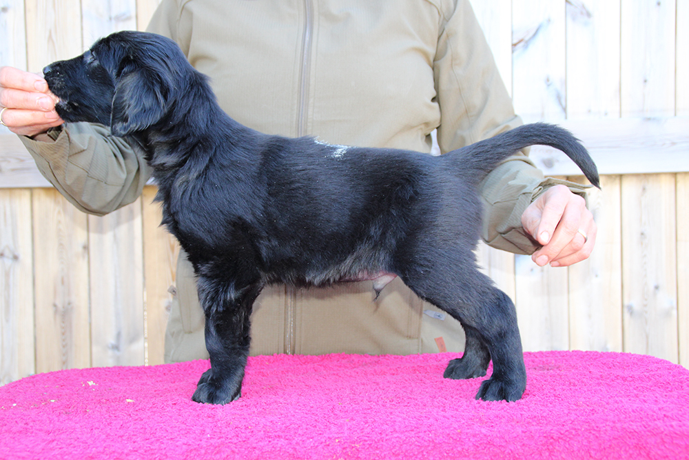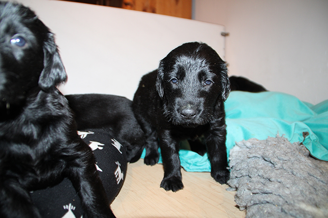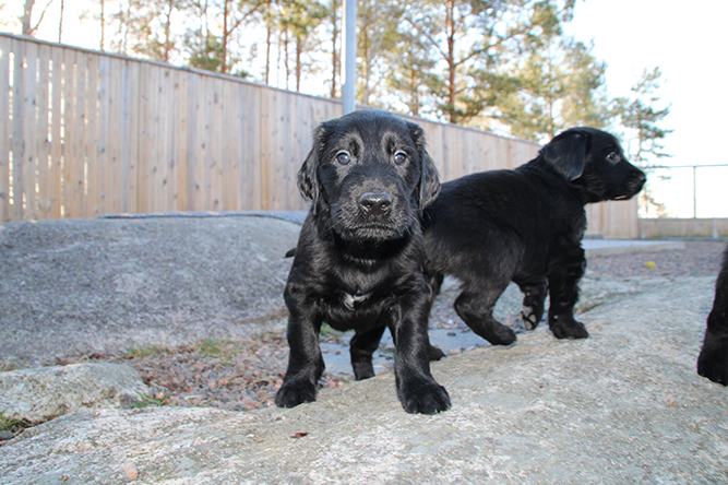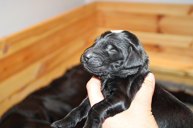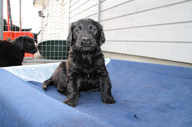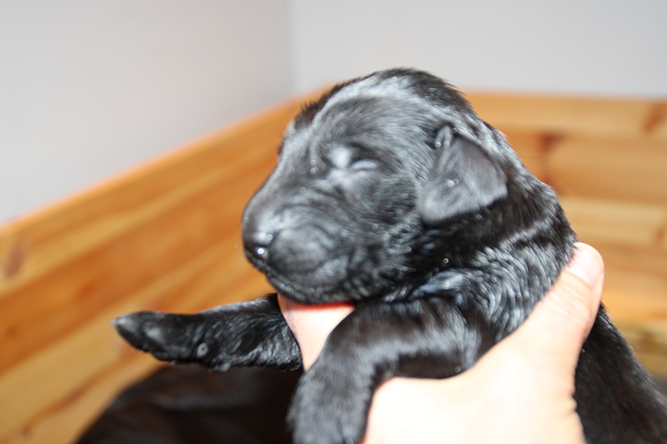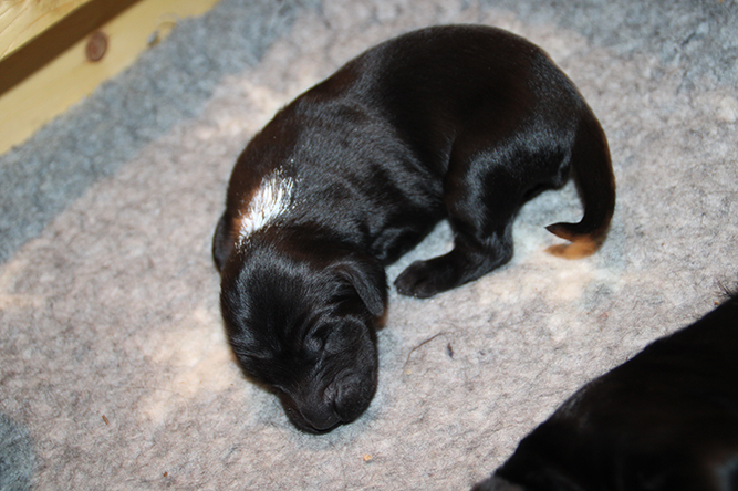 06.04.22. I dag er de skjønne små sorte gullene blitt 4 uker gamle Klo klipp er gjort nå kl 5 å vekten er sjekket ,alt er ok å de er så flinke. Oda fikk forhøyet temperatur i går men heldigvis fikk vi den under kontroll igjen i løpet av kvelden. Hun fikk en jurbetennelse i den ene puppen men er nå i god form igjen heldigvis. Ting skjer fort skal jeg love. Tror hun kan ha fått trekk av den sterke vinden selv om hun går med ull over puppene ute når vi lufter henne. Valpene passer hun godt på å ordner som vanlig her :-) Flinke Oda mamman det :-)Her er jente rumpe og Koda/ gutt rumpe