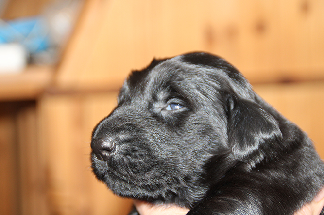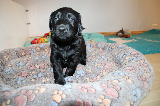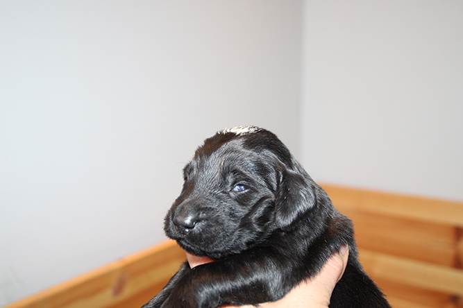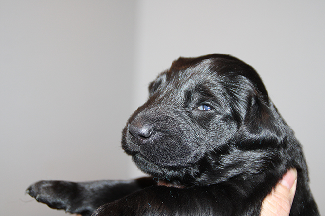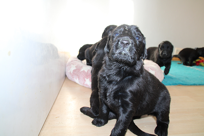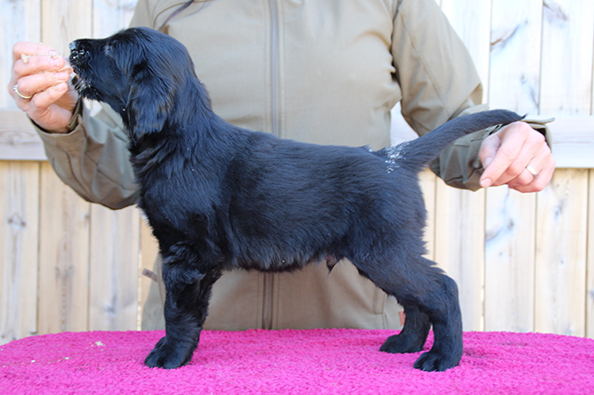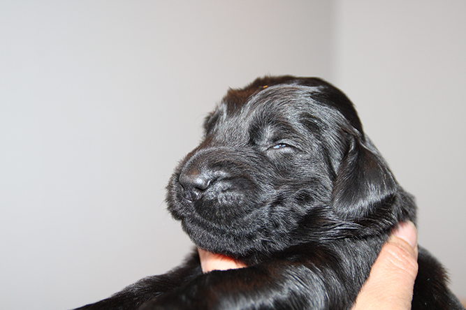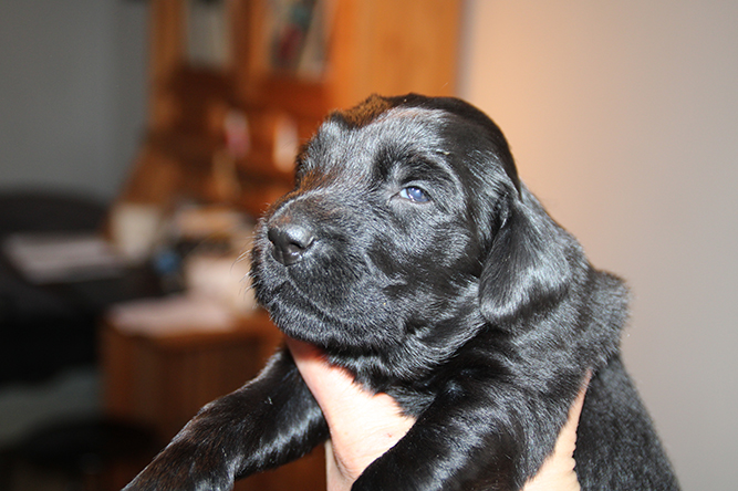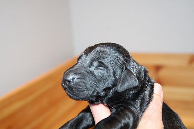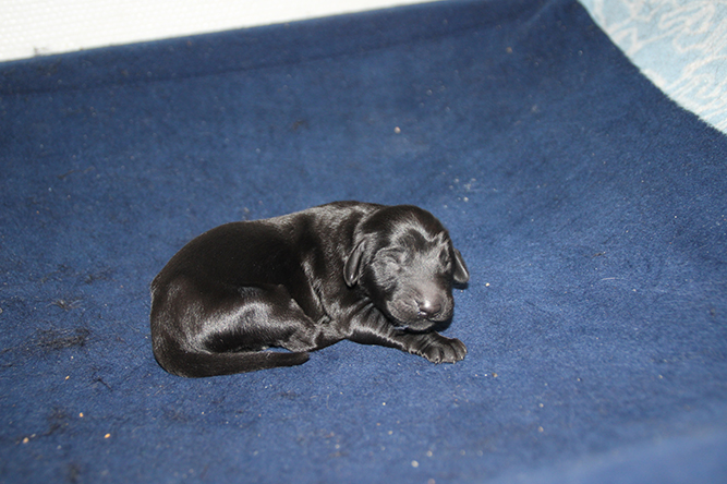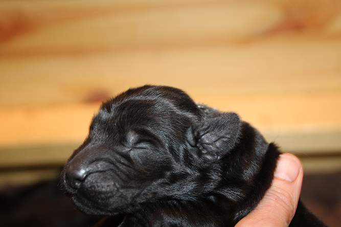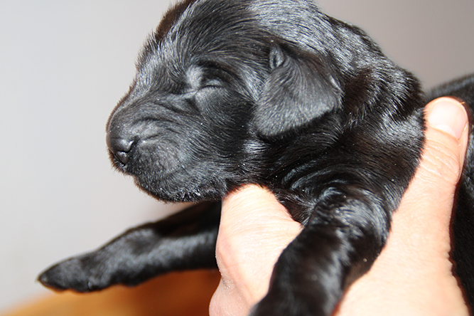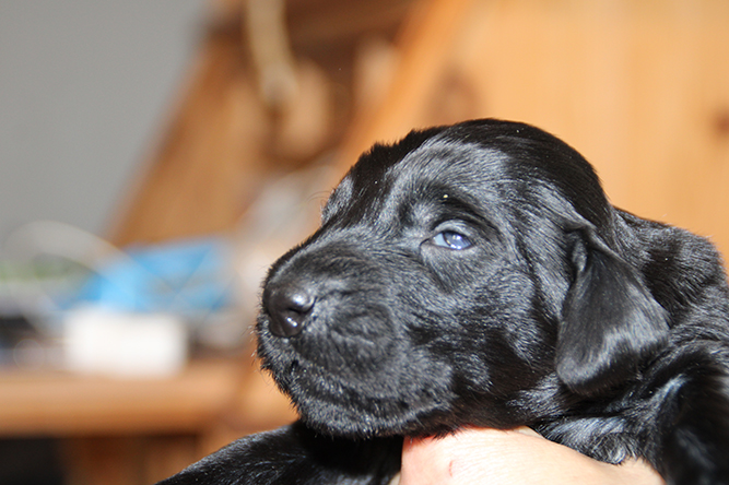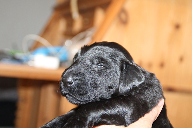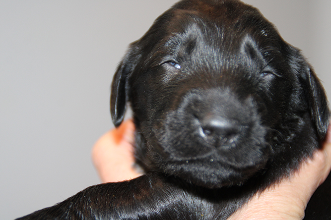 06.04.22. I dag er de skjønne små sorte gullene blitt 4 uker gamle Klo klipp er gjort nå kl 5 å vekten er sjekket ,alt er ok å de er så flinke. Oda fikk forhøyet temperatur i går men heldigvis fikk vi den under kontroll igjen i løpet av kvelden. Hun fikk en jurbetennelse i den ene puppen men er nå i god form igjen heldigvis. Ting skjer fort skal jeg love. Tror hun kan ha fått trekk av den sterke vinden selv om hun går med ull over puppene ute når vi lufter henne. Valpene passer hun godt på å ordner som vanlig her :-) Flinke Oda mamman det :-)Her er jente rumpe og Koda/ gutt rumpe