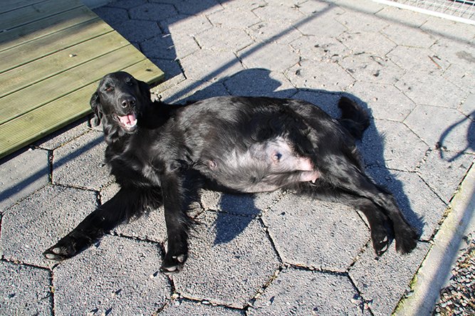 06.03.22Nå nærmer det seg fødsel på Oda hun er god å rund og måler 93 cm på det tykkeste og 78 cm på det tynneste. Hun har flyttet inn på valperommet for å bli trygg på at det er stedet for valper . Hun graver en del å ordner klart for valpene sine. I dag er hun på dag 59 etter første parring :-) Her er Oda