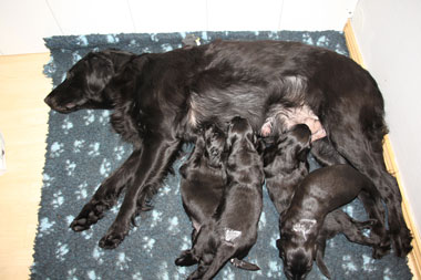 18.02.18. Her kommer endelig bilder av mor og barn. Med influensa så går det litt tregt her med alt jeg ikke må. Og etter å ha vært våken i hele natt måtte jeg sove litt. Giga og hennes 4 skjønne troll har det kjempe fint og jeg har akkurat kontroll veid de nå etter fødsel og alle 4 har lagt masse på seg. Det ble 3 gutter og en jente Emma :-) Jeg mangler 3 morkaker men tror det er tomt for valper. Giga kan også ha spist morkaker mens jeg duppet litt nå på morgen stunden. Kjell reiste på utstilling kl 5 i dag morges å det blir spennende å høre hvordan det går der i løpet av dagen. Jeg skulle jo egentlig vært med mens Marianne og Dag skulle vært her . Men det måtte jeg bare droppe så feber ør som jeg er nå :-) Så de tre reiste i steden sammen . Men det er jo heller ikke noe som er så fantastisk som å ligge å følge med på de skjønne små. Det er jeg som har malt de med hvite prikker for å se forskjell på de å kunne følge hver valp nøye helt fra fødsel :-) Her er Giga med sine skjønne små. Nybadet og fornøyd.