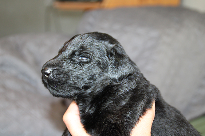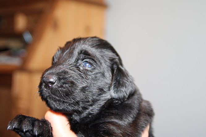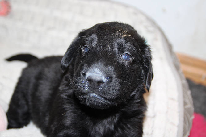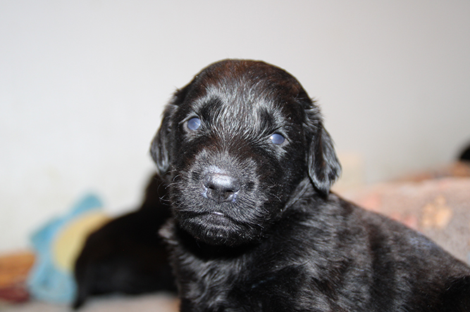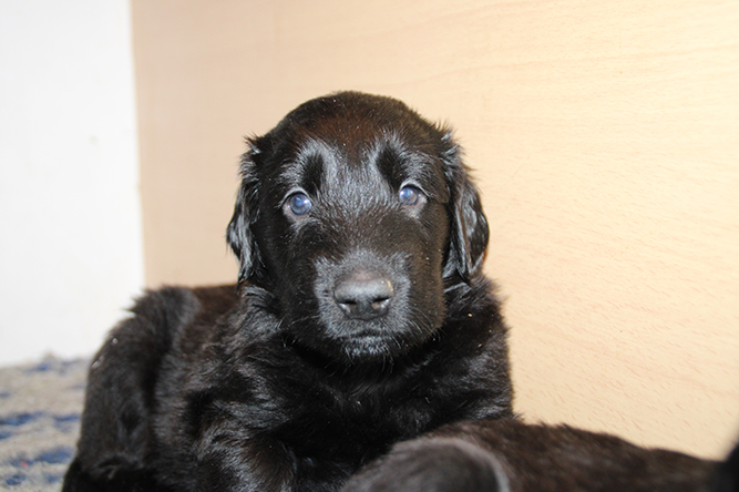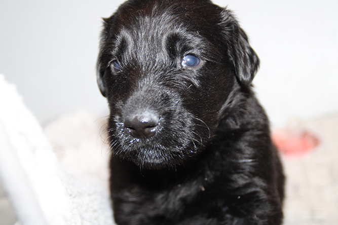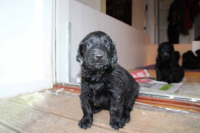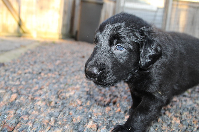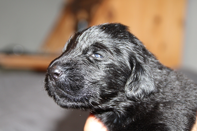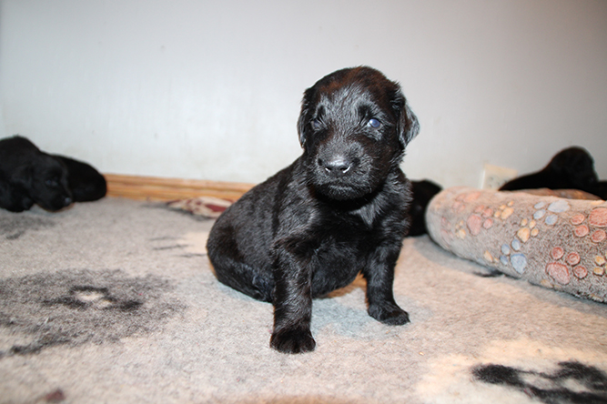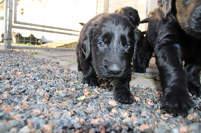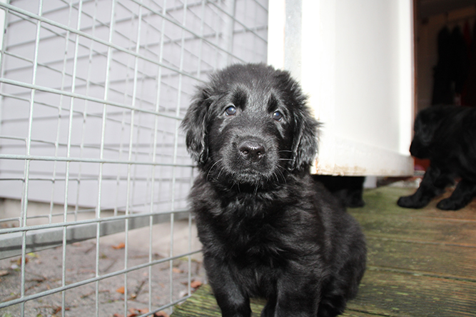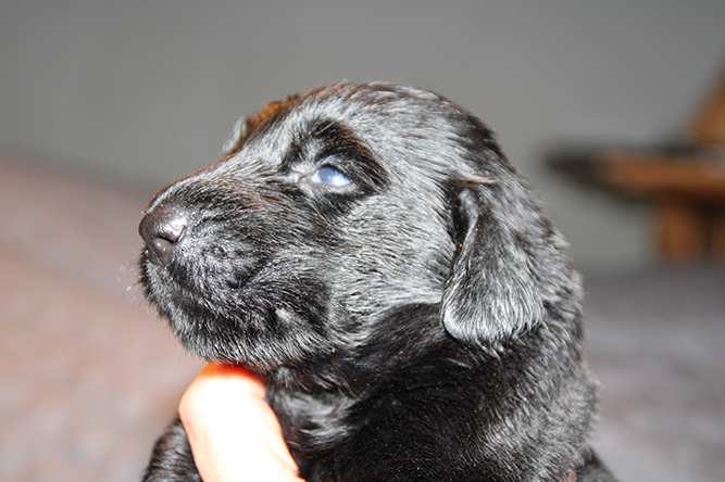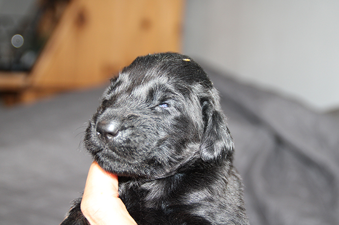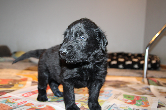 14.10.25. Utviklingen går i 100 her. I dag må vi åpne mer plass . De er blitt sykt flinke til å gå ut på avisene å gjøre i fra seg. I dag skal de få "gressplen" ved døren .jeg skjønner faktisk ikke hvordan folk klarer å ha valper i en liten valpekasse frem til 3 ukers alder. For her går det unna. De våkner å går helt ned i andre enden av innhegningen sin . Å de vokser så det knaker så det blir jo fort trangt. Hørselen har nå åpnet seg å de hører veldig godt når vi kommer inn i rommet. Da blir det liv :-)Her er gutt halen og gutt hode