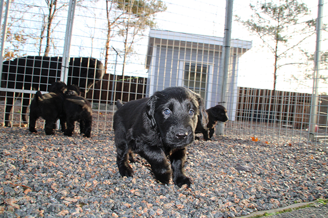 15.10.25.Trolla fikk mye større plass i går å det var populært :-) Utrolig hvor flinke de alt er blitt til å gå ut på avisene å helst helt i den andre enden av der de sover for å gjøre i fra seg. De har fått en liten gress plen ved døren også. Så vi er i gang med å trene rensligheten med å få ting ute og bort fra der man bor allerede :-) Blir de liggende for tett å i sin egen tiss å bæsj så er det jo ikke rart mange sliter med å få de rene når de får valp hjem ved 8 ukers alder. Da blir det en normal tilstand. De vil helst vekk fra der de har gjort i fra seg :-)Grøten går ned på høykant også. Nå får de 30 ml grøt 4 ganger pr dag. De vokser så det knaker her . Her er Gutt høyre bak og gutt venstre bak