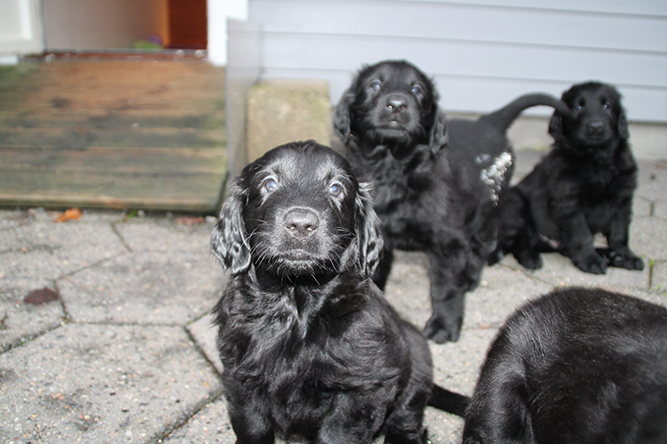 16.10.25. Den første spede leken har begynt . Så i går fikk de masse leker å holde på å sutte på å bite i også . Det var spennende det. Katten Katia tok seg en undersøkelse runde oppi valpekassen også i går. Kimmie er heldigvis en veldig snill hund så hun stoler helt på husets katter :-)Saga var en kjapp tur innom på besøk i går også. Hun er nå 45 dager på vei å er god å rund. Hun fikk være med litt jakt trening i går. Å er kjempe sprek . Men man ser jo at magen begynner å hemme henne mer :-) Her er jente rumpe og gutt rumpe
