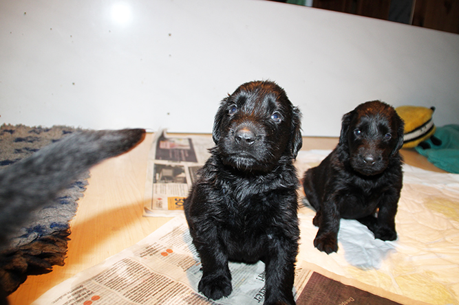 24.10.25. I går skjedde det masse her. 3 turer ut etter mat og masse bæsj og tiss ute. Deilig for meg :-) De synes det var en stoooor verden utenfor, besøk i går ettermiddag var også populært. Da tok vi en tur ut i stua. I dag sprut regner det her og det er meldt slik i hele dag så det spørs om vi tar turen ut. Det er masse besøk gjennom helgen å alle må passe på at de kommer til den tiden som er satt opp. Det er tett og valpene må få sove litt mellom besøkene. Husk at de er små enda å sovner fort også når de har vært våkne en stund. Derfor også like viktig å komme når vi har avtalt så de ikke sover seg gjennom hele besøket :-) VI TRENGER AVISER så ta med dere som har noen Spør naboen ,jobb o.sv om noen har aviser :-) Her er GHB og GVB