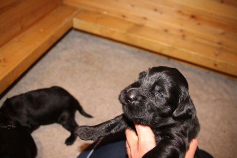 04.11.19. Nå har alle 4 åpnet øynene helt. De er bare så nydelige når de titter på en med de de skjønne blå øynene. Øynene er blå i starten men går gradevis over i grå nyanse før de til slutt blir nøtte brune. Det er vanskelig å få tatt fine bilder foreløpig med øynene åpne. de kniper igjen av det sterke lyset fra blitzen :-) Her er Gutt nakken og gutt merket halen.